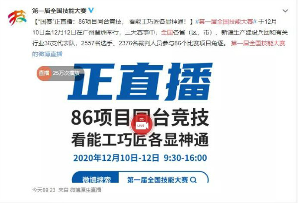 大賽受到全國廣泛關注和各大媒體報道,成為今日微博熱搜話題。本屆大賽從12月10日至13日舉辦三天,來自全國各?。▍^、市)、新疆生產建設兵團和有關行業36支代表隊,2557名選手、2376名裁判人員參與86個比賽項目大PK,涵蓋制造與工程技術、結構與建筑技術、運輸與物流等領域。