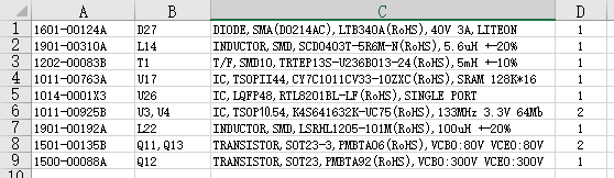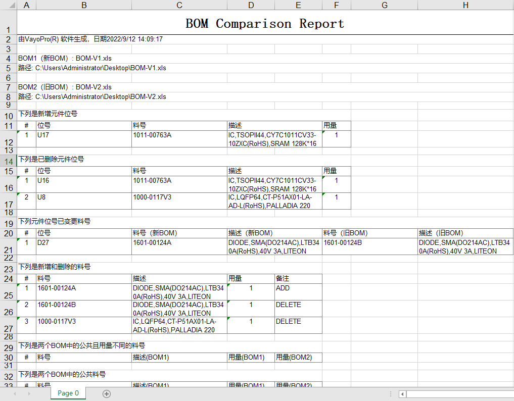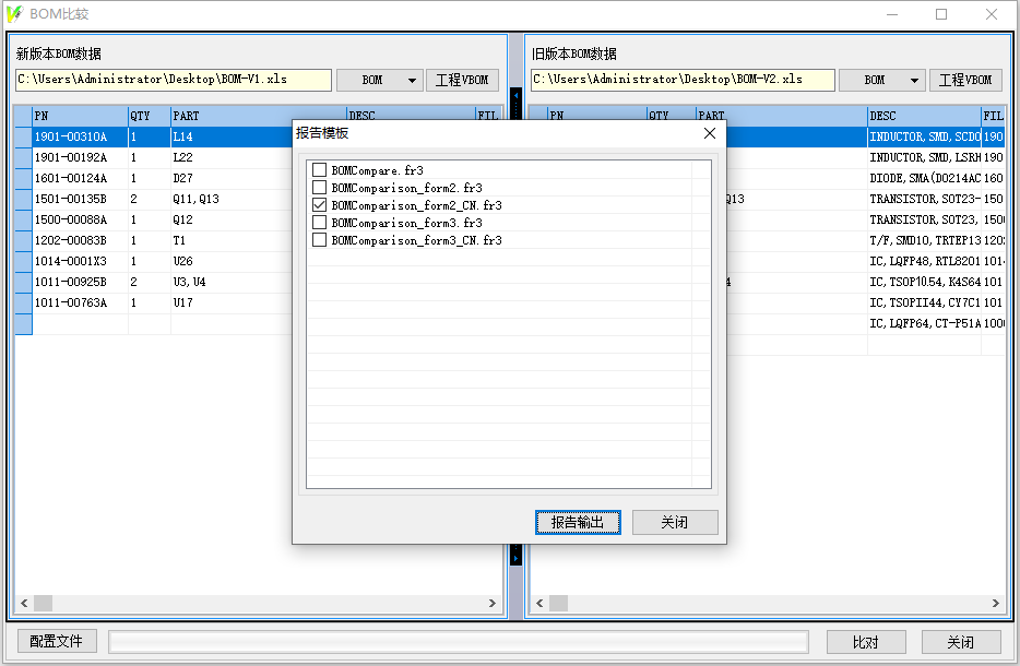 1.4:查看報告,報告中詳細列出了兩份BOM文件的同一物料的數量、位號等修改情況,以及是否物料增加或者刪除等