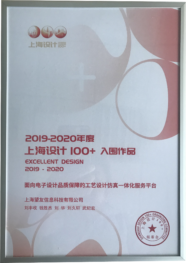 上海望友信息科技有限公司提報的《面向電子設計品質保障的工藝設計仿真一體化服務平臺》獲得2019-2020年度“上海設計100+入圍作品”。